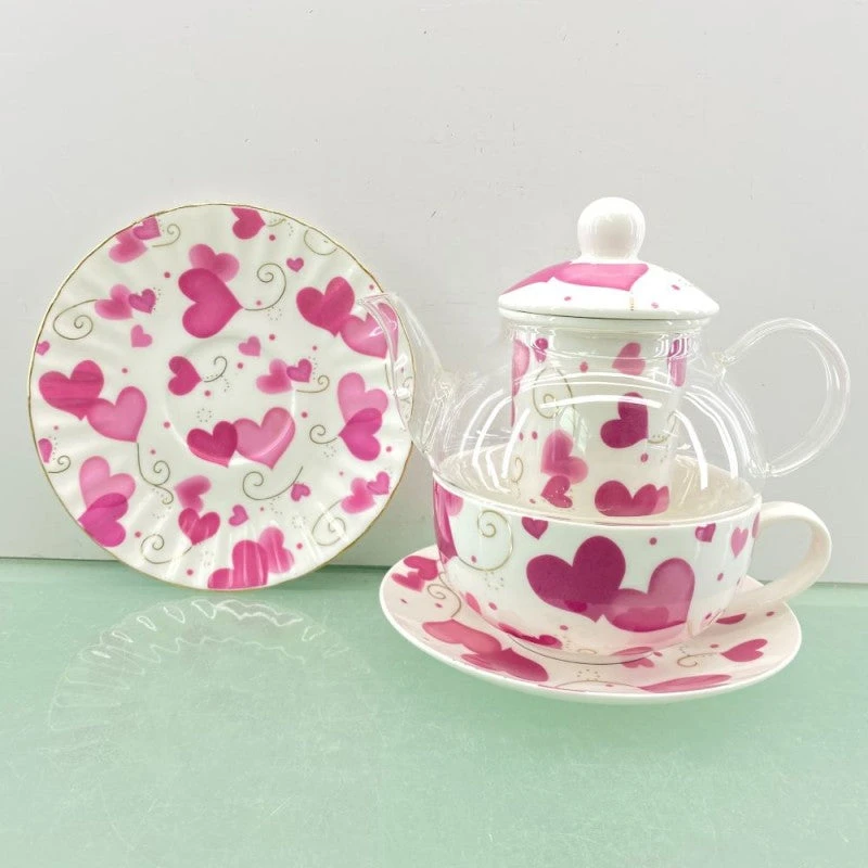 If love is symbolized by the shape of a heart, then this tea for one set is full of oodles of love! Send this beautiful 12 oz. clear glass, heart festooned teapot to someone you love. This set contains a multitude of various shaped, pink-toned hearts that surround the fine porcelain 5½” saucer and the 8 oz. cup and are replicated on the tea infuser and the teapot’s lid. Tiny gold scroll designs heighten the beauty of this outstanding 5-piece teaset.