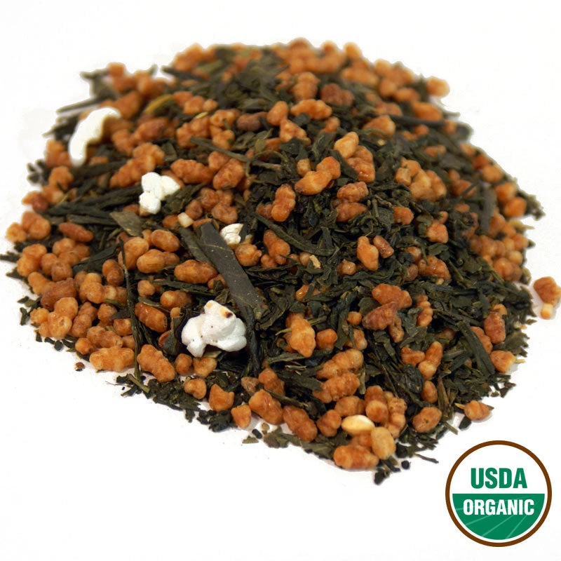 Genmaicha Green tea is a mixture of a Sencha and popped Genmai (hulled rice kernels), yielding a light brown tea with a smooth malty-barley taste. This organic version of Genmaicha has the same characteristics as our regular Genmaicha and is sure to please.