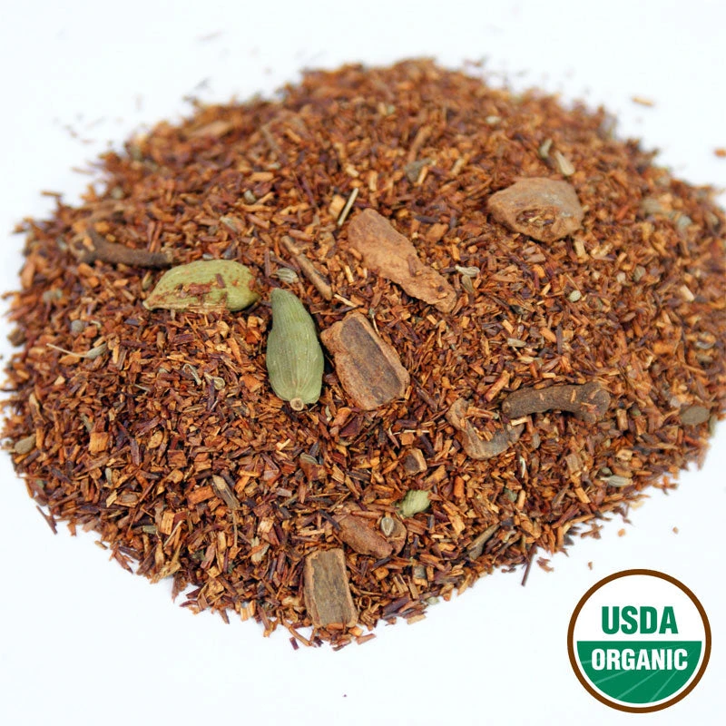 Ingredients: Organic Rooibos, organic cinnamon pieces, organic anise seeds, organic cloves, organic cardamom pods, natural chai flavor, and natural cinnamon flavor.